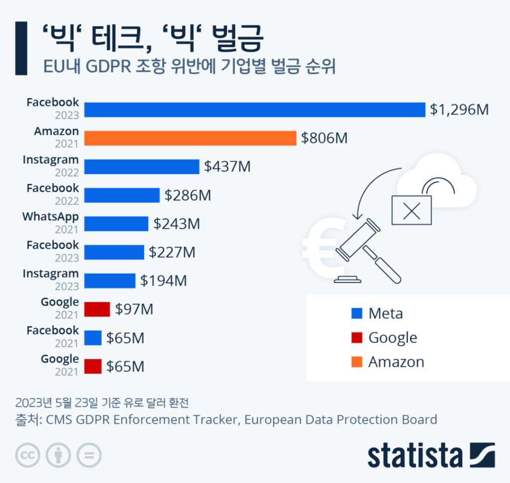 유럽의 GDPR은 2018년 시행 이후 가장 강력한 개인정보 보호 규제로 자리잡았습니다. 위반 시 최대 2천만 유로 또는 전 세계 연간 매출의 4% 중 높은 금액을 벌금으로 부과합니다. 2023년 한 해에만 24억 유로, 우리 돈으로 약 3조 5천억원의 벌금이 부과되었습니다. Meta는 2023년에 12억 유로, 약 1조 7천억원의 벌금을 냈습니다. 미국으로 사용자 데이터를 전송한 것이 문제였습니다. Amazon은 2021년에 7억 4천 6백만 유로, 약 1조원을 냈습니다. 타겟 광고를 위한 동의 절차가 불충분했기 때문입니다.