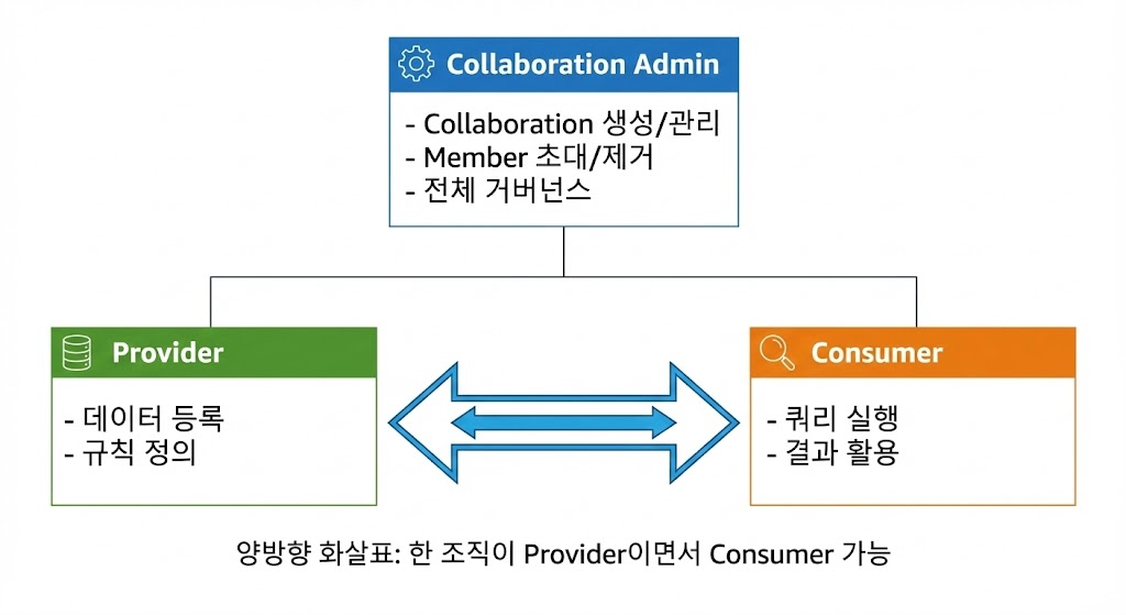 하나의 조직이 여러 역할을 동시에 수행할 수 있습니다. 두 리테일 기업이 서로의 고객 데이터를 교차 분석하는 경우, 각자가 Provider이면서 동시에 Consumer입니다.