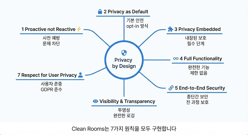 Clean Rooms은 사후적인 보안 조치가 아니라, 설계 단계부터 프라이버시를 고려합니다. Privacy-by-Design의 7가지 원칙을 모두 구현합니다.