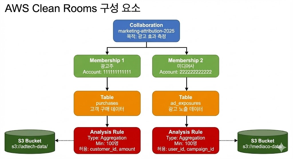 광고 Attribution 를 상상해보겠습니다. 광고주는 구매 데이터를 가지고 있습니다. customer_id, purchase_date, amount, product. 미디어사는 광고 노출 데이터를 가지고 있습니다. user_id, exposure_date, campaign_id, ad_id. 각자의 S3에 저장되어 있습니다. Clean Rooms에서 쿼리를 실행합니다. 두 테이블을 customer_iduser_id로 조인합니다. 광고 노출 후 7일 이내 구매를 찾습니다. 캠페인별로 집계합니다. 100명 이상인 그룹만 반환합니다. 결과는 campaign_id, converters, revenue입니다. 개별 고객 정보는 노출되지 않습니다. 광고주의 데이터는 광고주의 S3에 그대로 있습니다. 미디어사의 데이터는 미디어사의 S3에 그대로 있습니다.