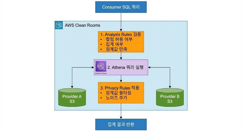회사 B가 SQL 쿼리를 작성합니다. Clean Rooms은 먼저 권한 규칙을 검증합니다. 허용되지 않은 컬럼을 사용했다면 거부합니다. 집계 없이 개별 레코드를 조회하려 한다면 거부합니다. 검증을 통과하면, Athena가 A의 S3에서 직접 데이터를 읽어 쿼리를 실행합니다. 결과에 프라이버시 규칙을 적용합니다. 100명 미만의 그룹은 제거합니다. 필요하면 노이즈를 추가합니다. 최종 결과만 B에게 반환합니다.