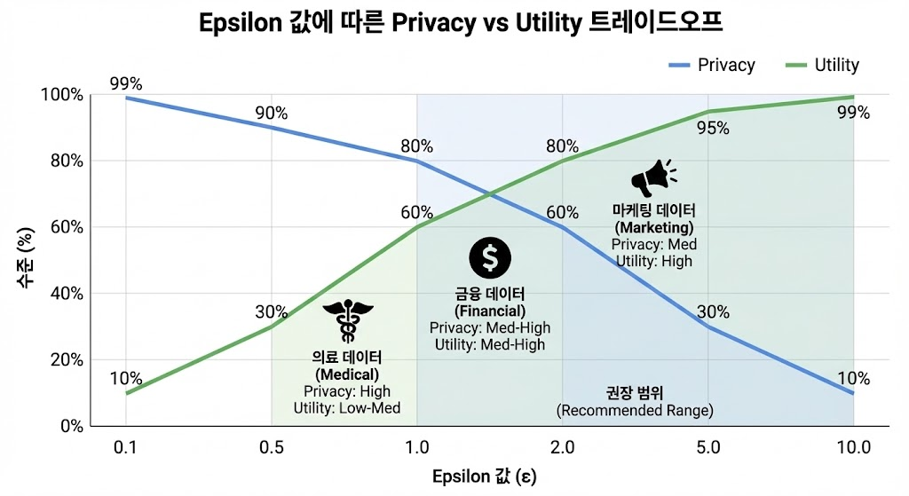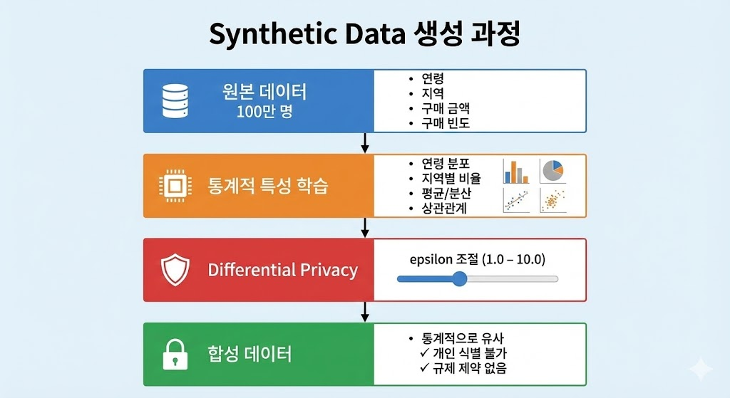 Differential Privacy 기반입니다. 수학적으로 증명 가능한 프라이버시 보장입니다. 원본 데이터의 개별 레코드를 역추적하는 것이 불가능합니다. epsilon 파라미터로 프라이버시 강도를 조절합니다. epsilon이 낮을수록 프라이버시가 강하지만, 데이터 유용성은 다소 감소합니다. epsilon이 높을수록 데이터 유용성이 높지만, 프라이버시는 다소 약해집니다. 일반적으로 epsilon 1.0-10.0 범위를 사용합니다.