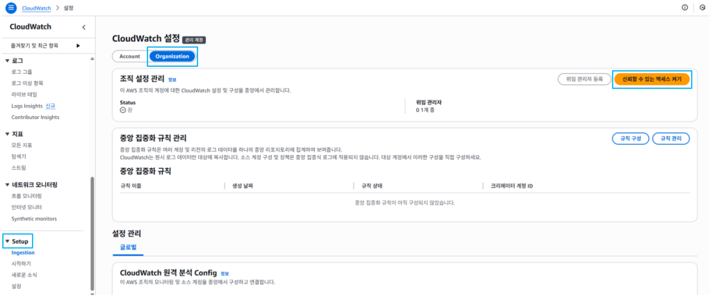 (1) 조직의 관리 계정에서 로그인 후 [CloudWatch] 의 [설정] 클릭 후 [조직] 탭에서 [신뢰할 수 있는 액세스 켜기] 를 클릭합니다.