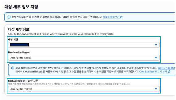 (4) [대상 세부 정보 지정] 에서 대상 계정, 대상 리전, 백업 리전을 선택합니다. (※ 대상 계정을 15로 시작하는 계정으로 선택했습니다.)