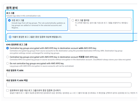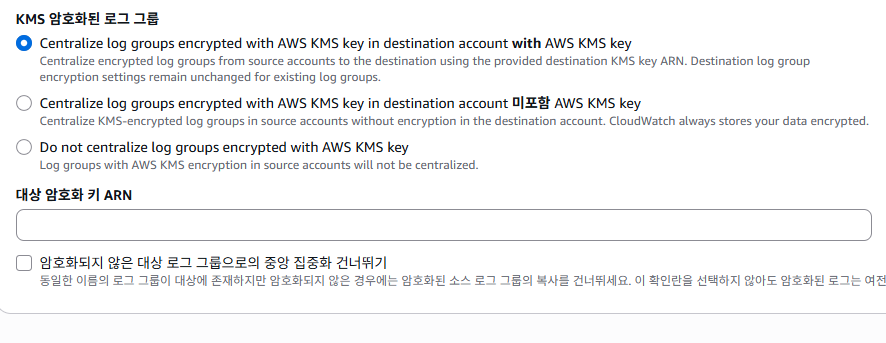 추가적으로 로그 그룹을 전달 시, KMS 암호화를 어떻게 처리할지 설정하실 수도 있습니다.