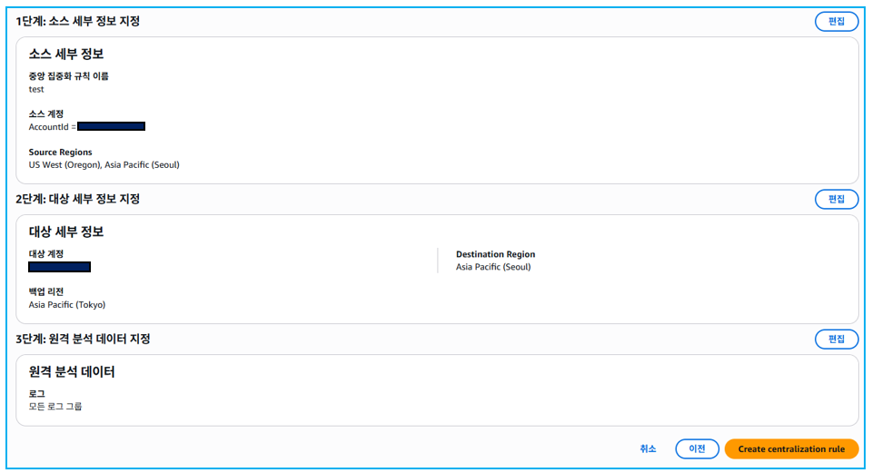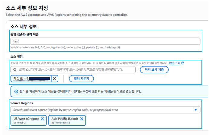 (3) [소스 세부 정보 지정] 탭에서 규칙 이름, 소스 계정, 소스 리전을 선택합니다. (※ 소스 계정을 72 로 시작하는 계정으로 선택했습니다.)