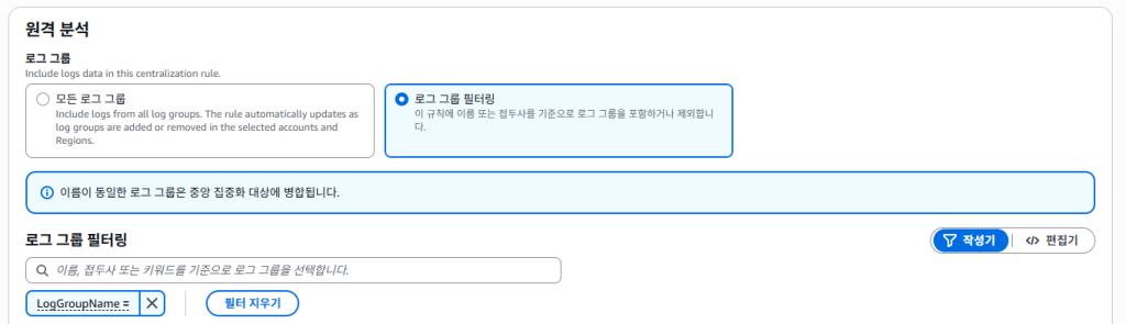 ※ 다음과 같이 로그 그룹 이름을 기반으로 로그 그룹 필터링을 하실 수도 있습니다.