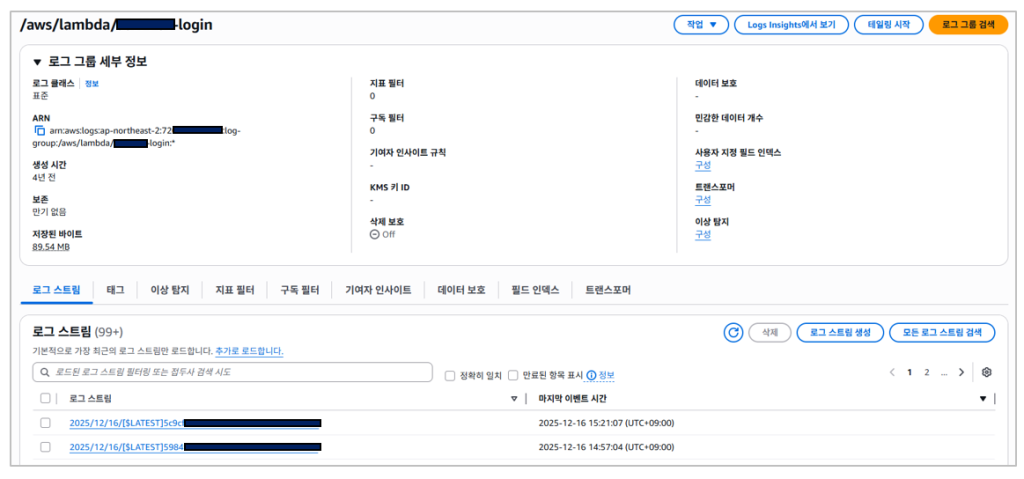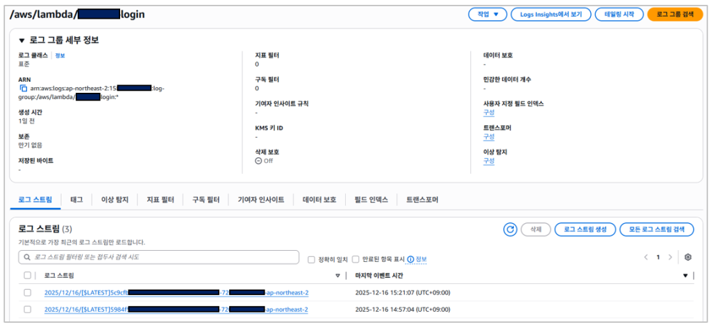 한 가지 특이점은 로그 스트림 이름에 “소스 계정 정보” (Ex. 72xxxxxxxxxx-ap-northeast-2) 가 추가로 부착되어 있는 것을 확인할 수 있습니다.