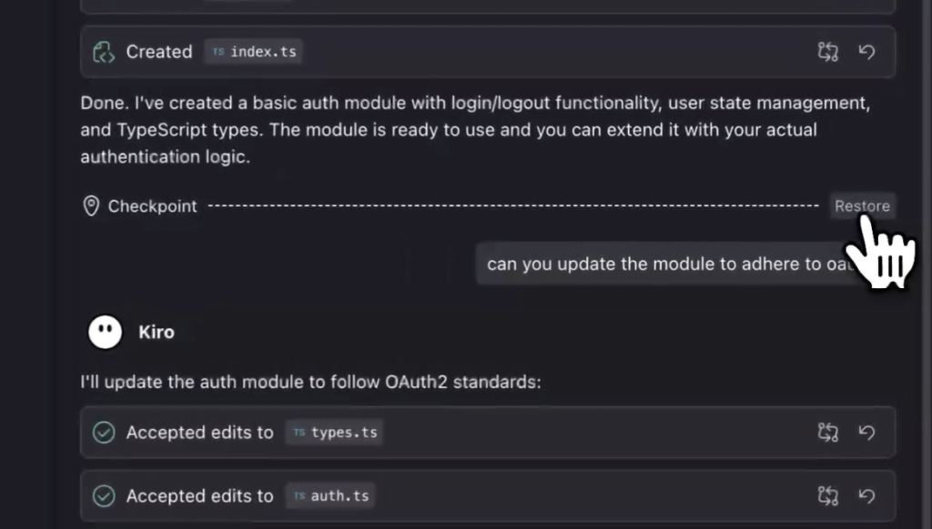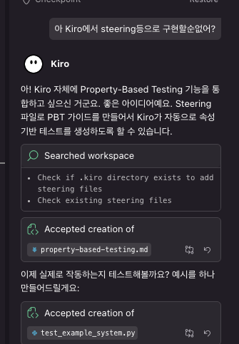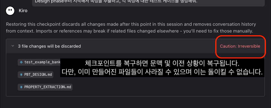 이때 진짜 문제는 꼬여버린 코드와 더불어 ‘대화의 맥락’을 찾기위해 Checkpoint-Restore를 클릭해주면 돌아갈 수 있습니다. 언제든 ‘Restore(복원)’ 버튼을 누르면, 에이전트가 변경한 모든 파일은 물론 대화 히스토리까지 해당 시점으로 완벽하게 돌아갑니다. 이러한 Kiro의 체크포인트 시스템은 사용자가 따로 설정하지 않아도 언제든지 사용할 수 있습니다.