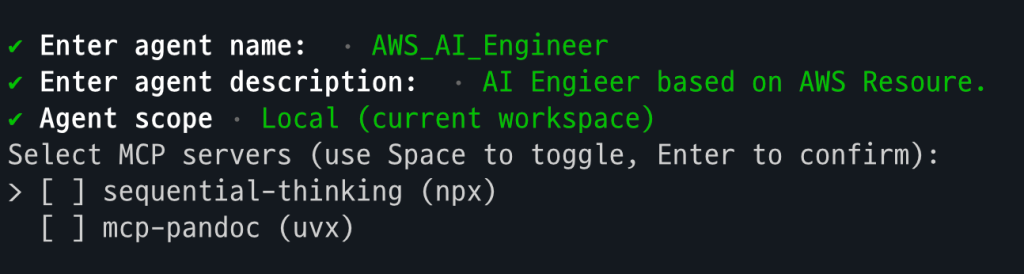 이후에 아래와 같이 접속 하기 위한 agent name과 agent에 대한 설명부터 사전에 정의된 MCP까지 순서대로 정보를 입력해주면 빠르게 Task별로 custom-agent 설정이 가능합니다.