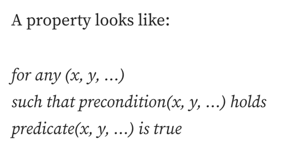 여기서 속성이란 “어떤 입력값(Any inputs)이 주어지더라도, 특정 전제 조건 하에서는 반드시 예상된 동작(Predicate)이 참(True)이어야 한다”는 것을 의미합니다.