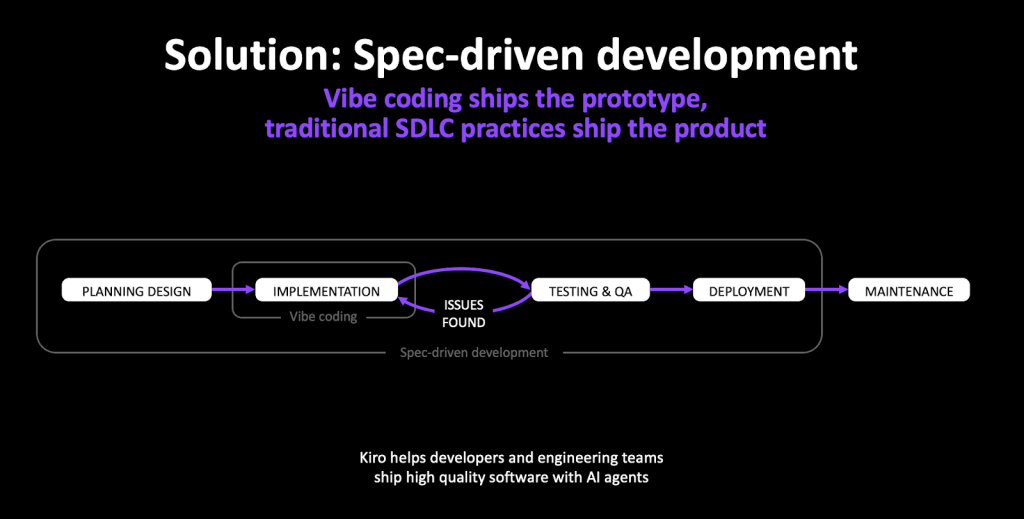Spec-driven development란 디자인하고, 그 디자인을 기반으로 코드를 구현하는 것 – (출처 : Kiro 공식 blog)