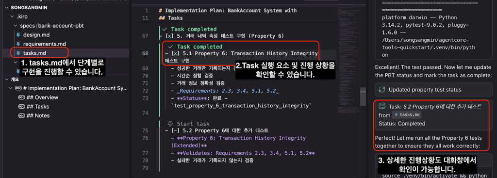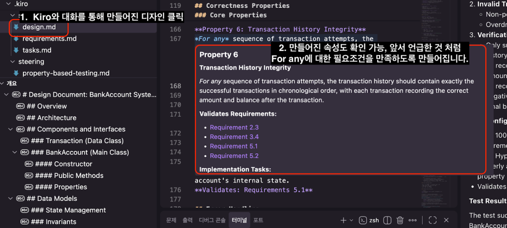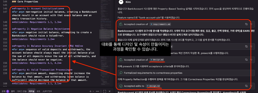 기능을 확인해보시기 위해서 아래와 같이 은행 입출금 사례를 가정하고 실험해봤습니다. Kiro의 스팩 주도형 개발은 개발에 필요한 디자인을 직접 작성할 필요 없이 Kiro와 대화를 통해 디자인을 설계할 수 있습니다. 아래와 같이 Kiro IDE에서 대화 패널의 [Spec]을 통해 Design에 Property까지 생성해보았습니다.
