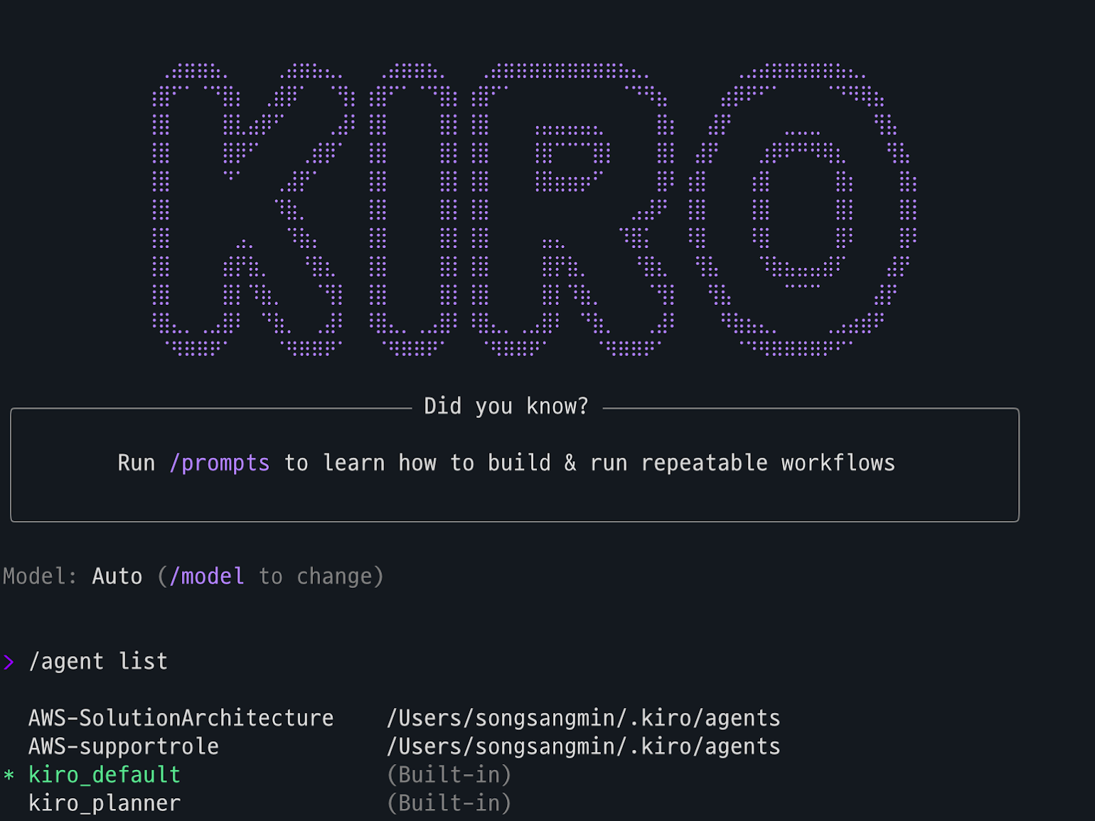 Global Custom Agent모든 디렉터리 및 프로젝트에서 사용 가능~/kiro/agents/{agent-name).json
