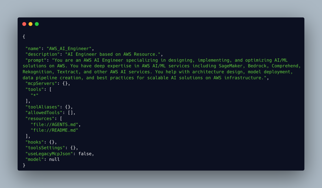 최종적으로 아래와 같이 생성 및 저장이 완료되었다는 문구가 화면에 나타나면, 해당 파일은 ~/.kiro/agents/AWS_AI_Engineer(지정에이전트명)에서 확인할 수 있습니다.