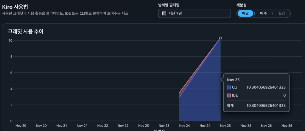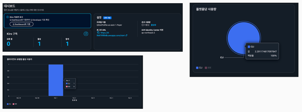 하지만 아직까진 대시보드에서 사용자 개인별로 크레딧 및 프롬프트 등을 확인할 수는 없었습니다. 대신, Kiro usage dashboard 사용량 대시보드 활성화를 통해 개발자가 서비스를 어떻게 사용하는지 지표를 지정된 S3에 CSV로 제공받을 수 있습니다. 이를 third party를 통한 시각화를 진행하여, 매월 이용 현황을 모니터링에 이용할 수 있습니다.