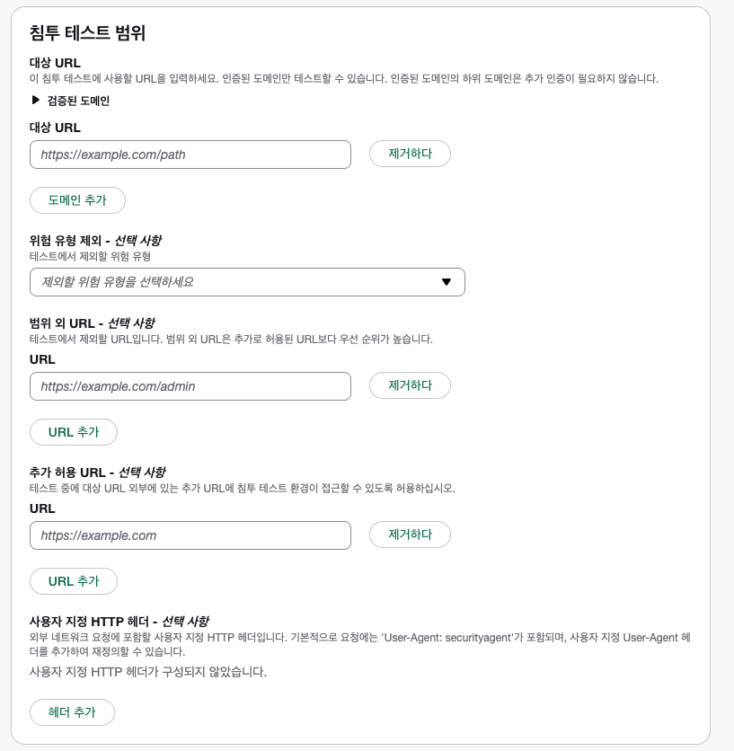 • 범위: 테스드 대상 도메인을 지정하여 OWASP Top 10 취약점은 기본, 아래와 같이 총 13개 위험 카테고리를 기반으로 테스트를 진행합니다.