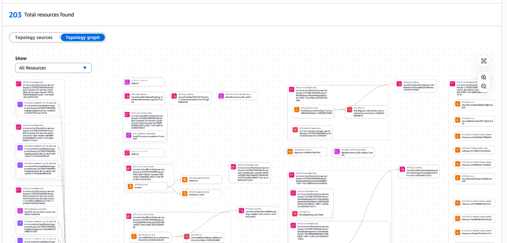 • 지능형 토폴로지 분석: AWS에 프로비저닝 된 관련 리소스들을 수집, 그래프화 하여 “A서버가 죽었다”에서 끝나는 게 아니라, “최근 배포된 B마이크로서비스의 변경 사항 때문에 DB 커넥션 풀이 말라서 A가 죽었다”는 인과관계를 파악합니다.