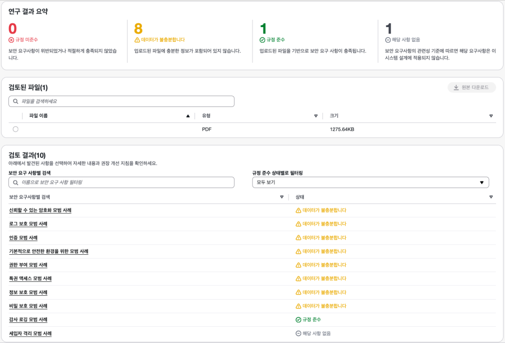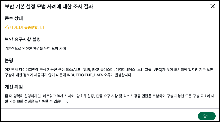 실제 활용 과정에서 마주한 현실적인 한계점도 있었습니다. 예를 들어 Security Agent의 Design Review 기능을 직접 테스트해 본 결과, 단순히 기존에 보유한 Drwaio 기반 아키텍처 다이어그램만으로는 규정 준수 여부를 판별하기에 ‘데이터가 불충분하다’는 답변을 받았습니다. AI가 인프라의 맥락을 정확히 이해하고 분석하기 위해서는, 아키텍처 정의서와 현재 사용 중인 보안 서비스 내역을 구체적으로 다시 정리해서 입력해 줘야 하는 별도의 준비 과정이 필요했습니다.