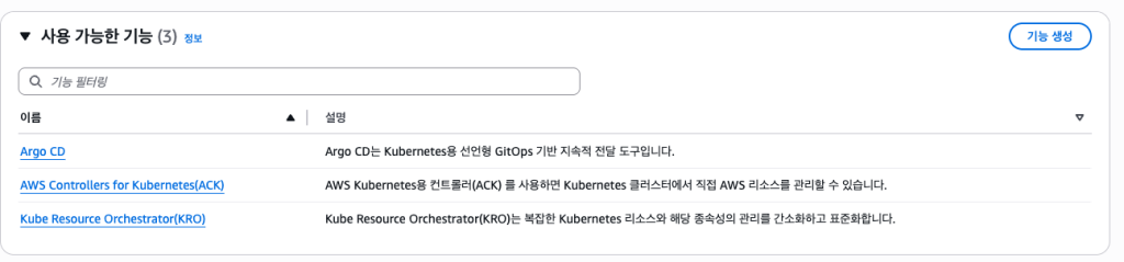출시와 함께 제공되는 세 가지 핵심 기능은 Argo CD, AWS Controllers for Kubernetes (ACK), 그리고 Kube Resource Orchestrator (KRO)입니다.