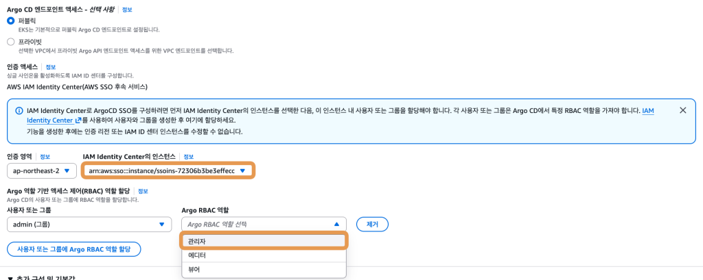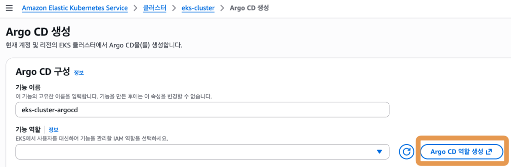 Argo CD 역할 생성 버튼을 통해, 자동으로 역할을 생성해서 할당합니다