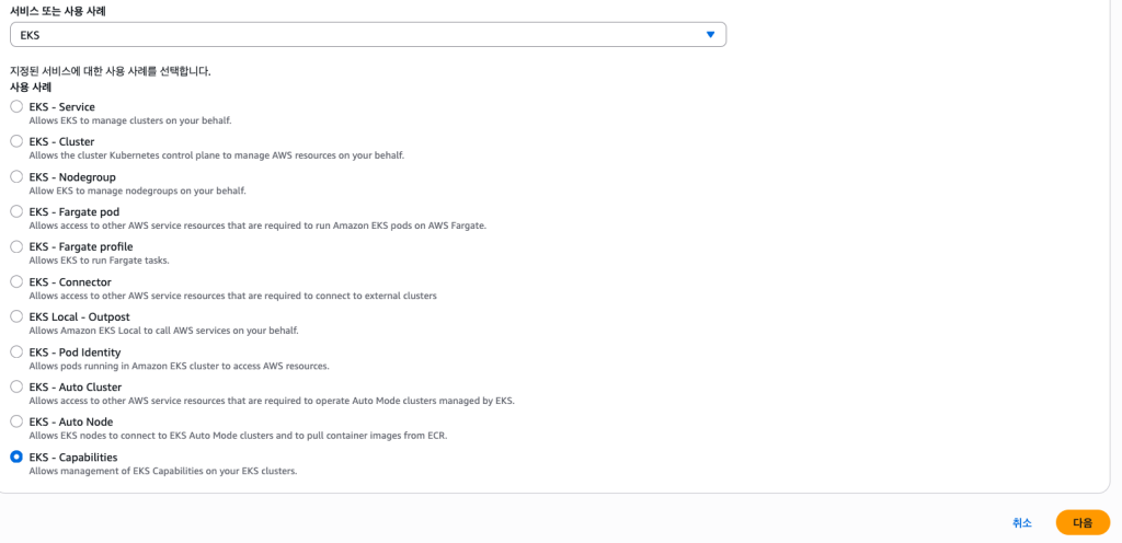 역할생성의 경우 사용사례(EKS – Capabilities) 에 대해서 자동으로 적절한 Policy가 할당되며, 추후 수정이 가능합니다. 보안 및 권한 관리는 IAM과 Kubernetes RBAC를 함께 사용하여 세밀한 권한 제어를 제공합니다