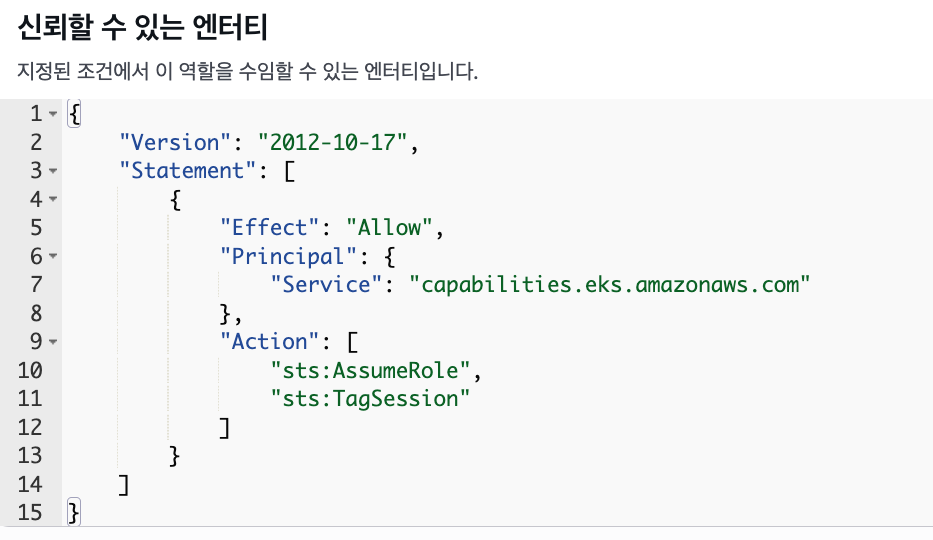 해당 역할은 EKS Capabilities 에서만 접근될 수 있도록 신뢰관계가 구축됩니다